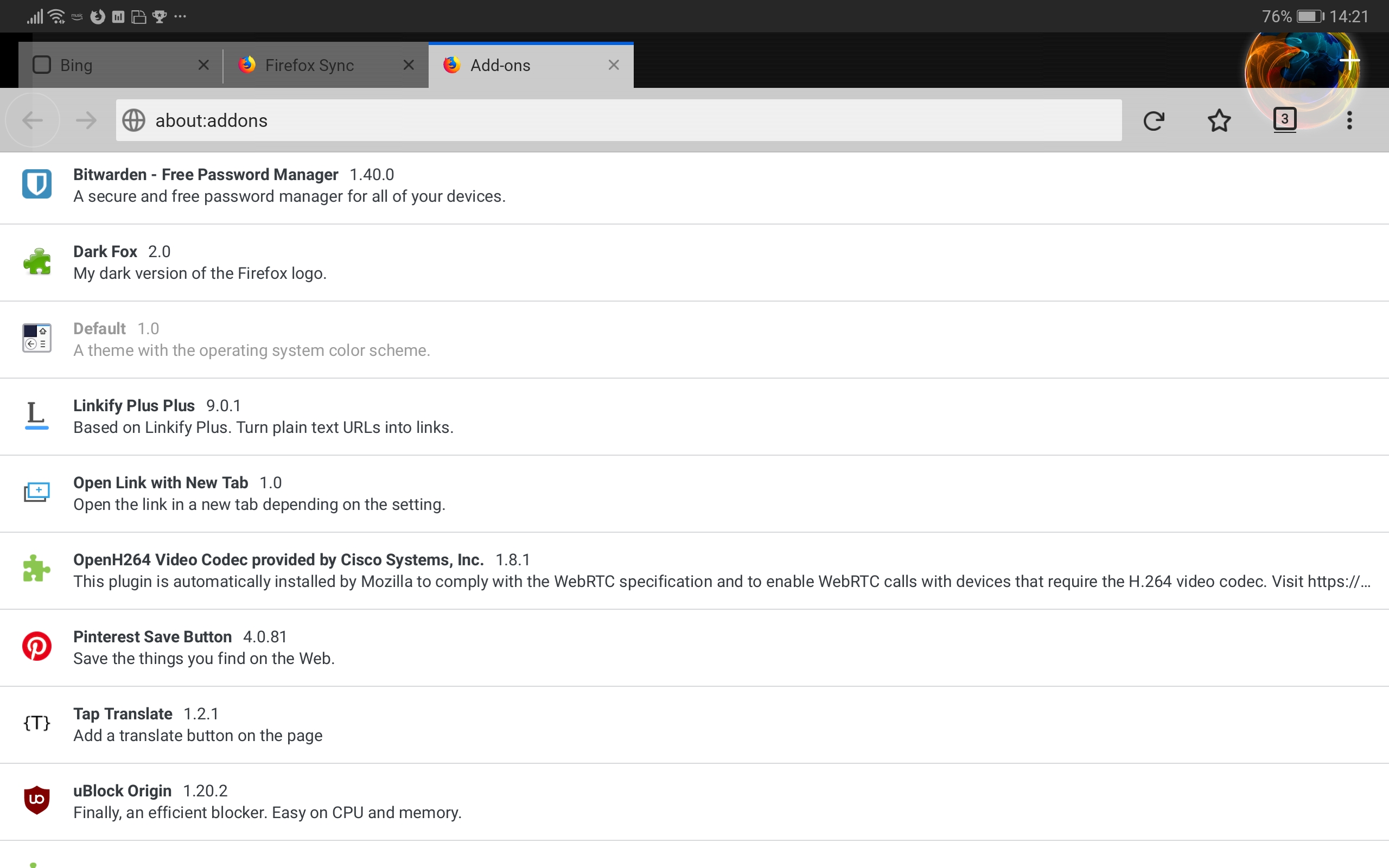• OK ich gebe nicht auf, und benutze den Fenix auf meinem Huawei Mediapad M5 10.8. Der Fenix synchronisiert ja auch automatisch ? - im Gegensatz zum Firefox - was aber offenbar Huawei anzulasten ist und nicht Mozilla, denn auf meinem alten Samsung Galaxy Tab S klappt es ja auch.
