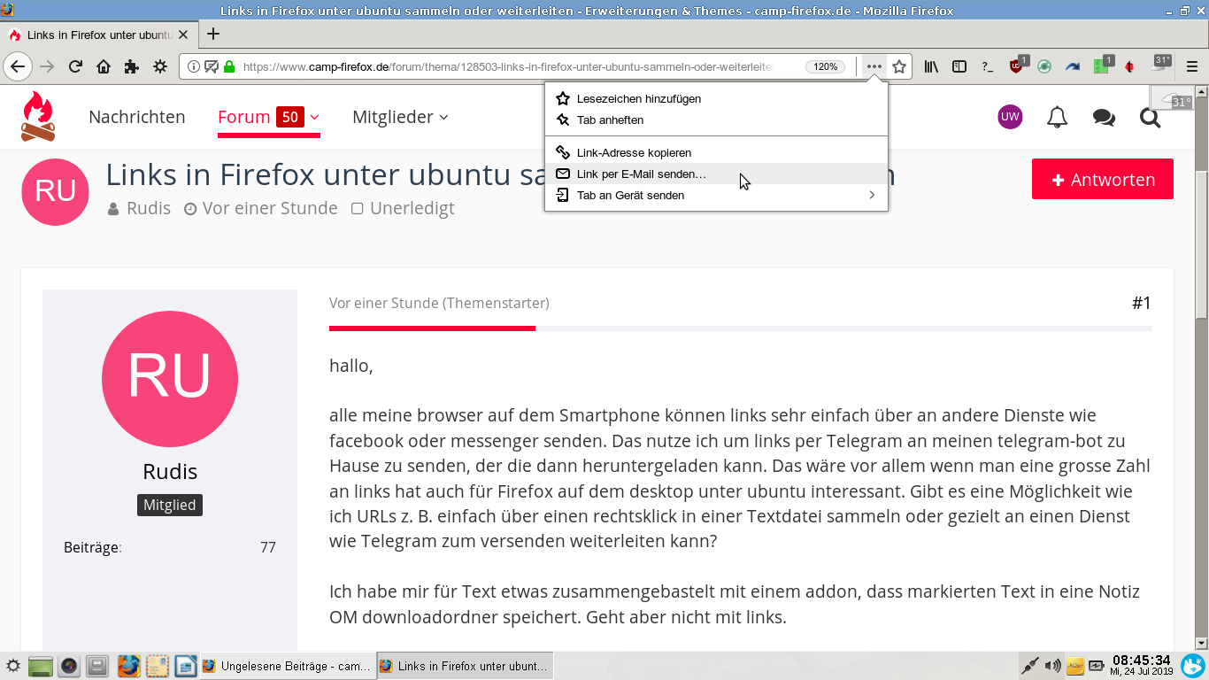 alle meine browser auf dem Smartphone können links sehr einfach über an andere Dienste wie facebook oder messenger senden. Das nutze ich um links per Telegram an meinen telegram-bot zu Hause zu senden, der die dann heruntergeladen kann. Das wäre vor allem wenn man eine grosse Zahl an links hat auch für Firefox auf dem desktop unter ubuntu interessant. Gibt es eine Möglichkeit wie ich URLs z. B. einfach über einen rechtsklick in einer Textdatei sammeln oder gezielt an einen Dienst wie Telegram zum versenden weiterleiten kann?