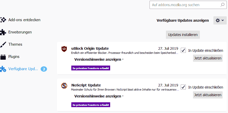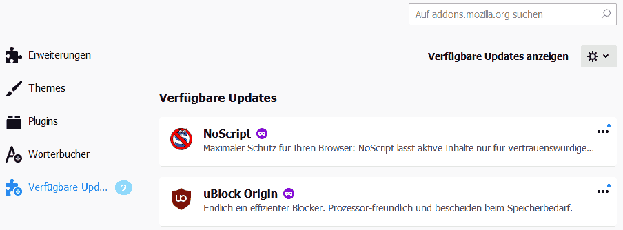 Wenn nun Updates für mehrere Erweiterungen verfügbar sind, so konnte man bis FF 67 auf eine Schaltfläche "Updates installieren" klicken und FF installierte daraufhin alle Updates. In FF 68 fehlt diese Schaltfläche. Deshalb muss man nun
