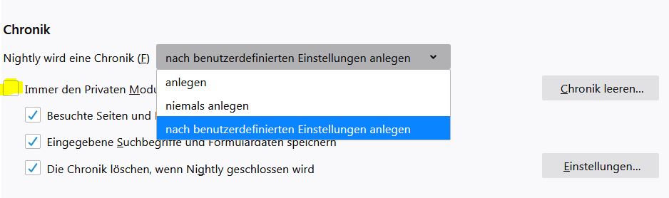 Wie gesagt, wenn die Einstellung auf "anlegen" gesetzt ist, können die Einstellungen, die zu "benutzerdefiniert" gehören, nicht wirken. Das ist ausgeschlossen. Oder anders gesagt: Würden diese wirken, hätte Firefox einen schwerwiegenden Fehler, der ziemlich viele Nutzer betreffen würde.