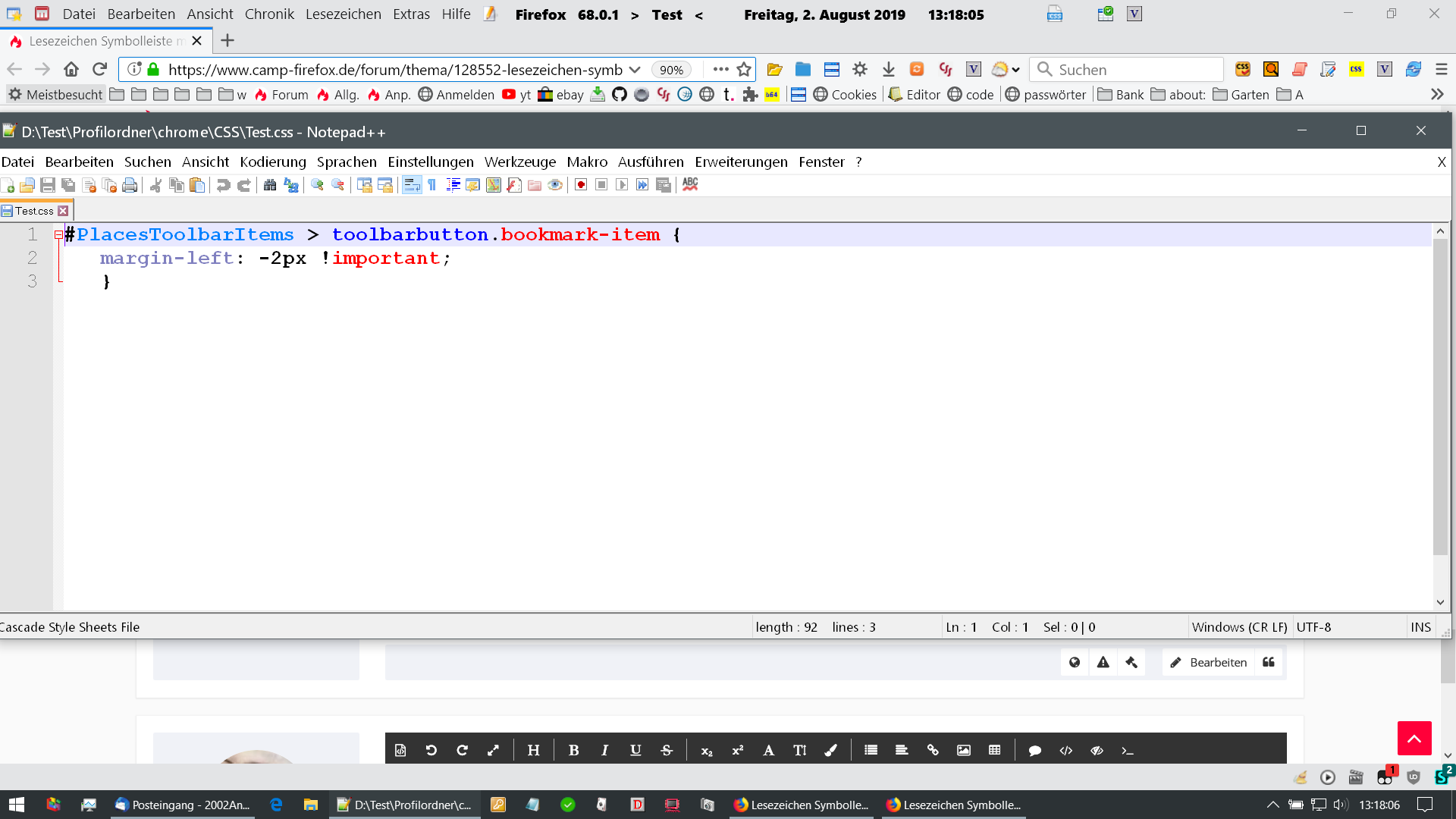 Dazu benutze ich eine userchrome.css mit dem folgenden Code, den ich von der Seite (https://www.windowspower.de/firefox-66-meh…lleiste-update/) habe.