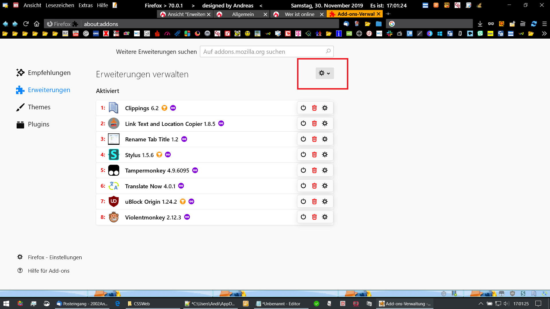 Ansicht "Erweiterungen verwalten"