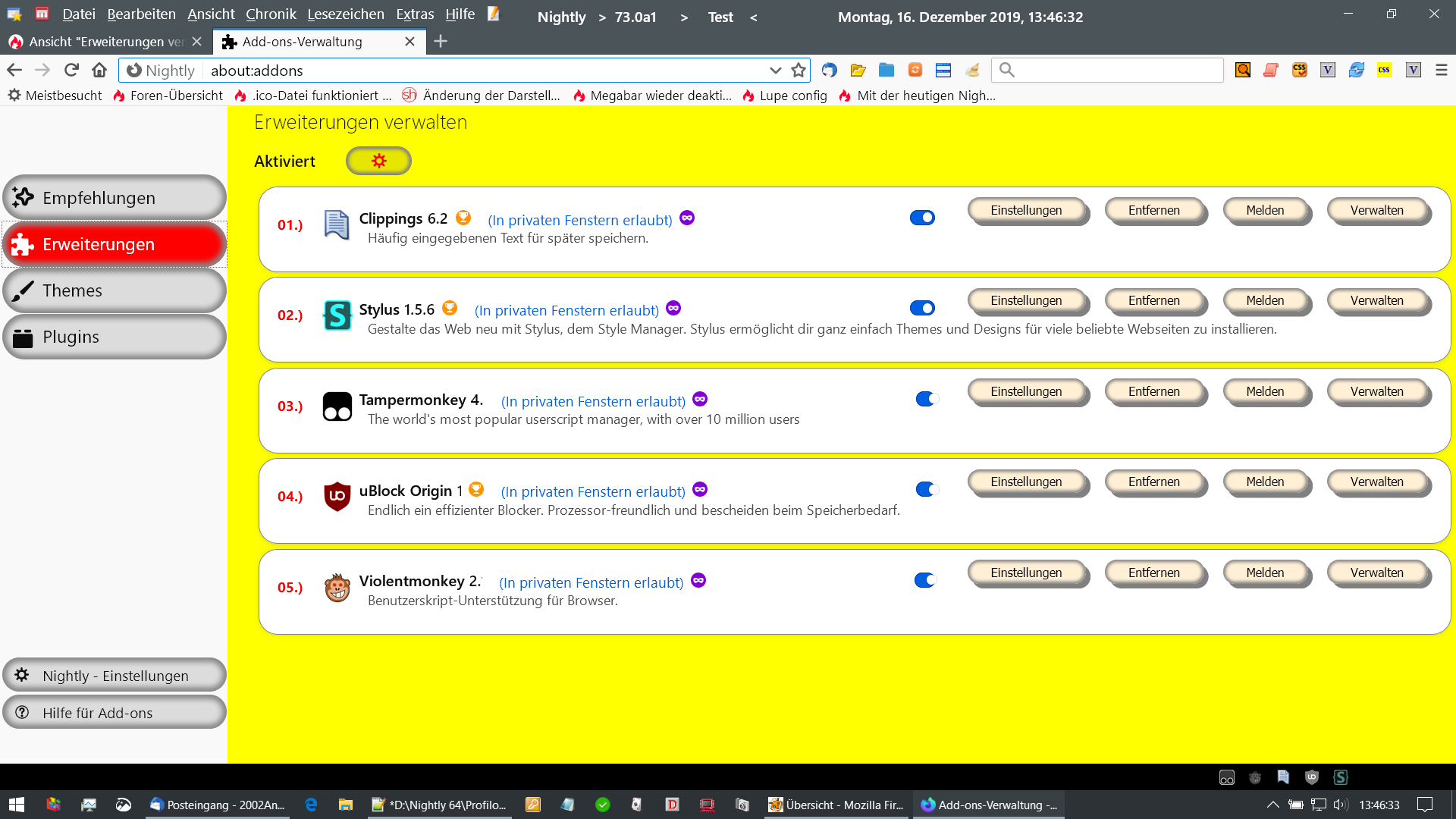 • In letzter Zeit kommt es im Addon-Manager, an dem ich auch mit gebastelt habe, immer mal zu Fehlern. Zuletzt in der 77 Beta nach dem letzten Update, wo unter Themes keine Grafiken mehr angezeigt werden (hatte ich auch schon in anderen Versionen). Deshalb hatte ich mich entschlossen mal einen neuen zu basteln. Dieser enthält hauptsächlich Codes von Aris, und alles was ich bisher hier zusammentragen konnte ( die fleißigen Helfer sind hier zur Genüge bekannt :thumbup:).