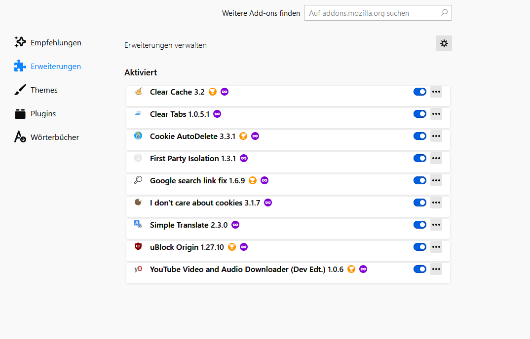 bin nun mal meine Versionen und Profile durchgegangen. Tatsächlich werden mir in Firefox Beta bei Aufruf "about:addons" auf der linken Seite nur die Buttons ohne Icons angezeigt: