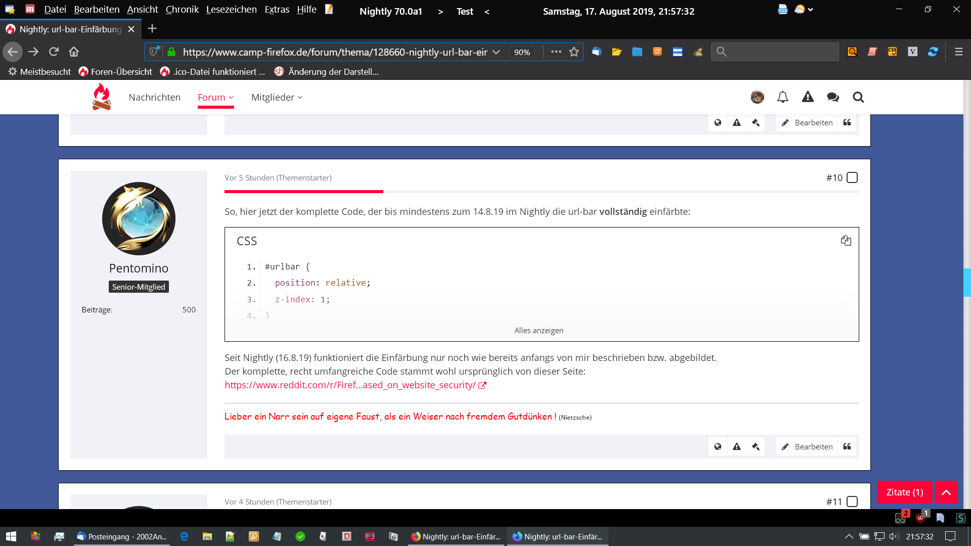 Hier liegt das ZIP und wird entpackt für solch seltenen Fälle. Mit dem Codeschnipsel #urlbar von dir sind dann innerhalb einer Sekunde alle Fundstellen aufgelistet (S&R Funduc) und dort konnte ich eben sehen, dass dort etliche Tags noch dranhängen, die genau das bewirken sollen. Dass die dann in v70 nicht mehr funktionieren, ist eine andere Sache - es wurde ja angemerkt, dass ::after nur noch bis v68 (evtl v69) funktioniert. Deswegen beschränke ich mich auf ganz wenig, weil ich keinen Bock auf diesen Popanz habe wie damals. Die wenige Styles sind sortiert und vor allem separiert (also nicht alles in eine Datei geklatscht), u.a. nach "ctr" für eine schnellere Fehlersuche und entsprechend dokumentiert.