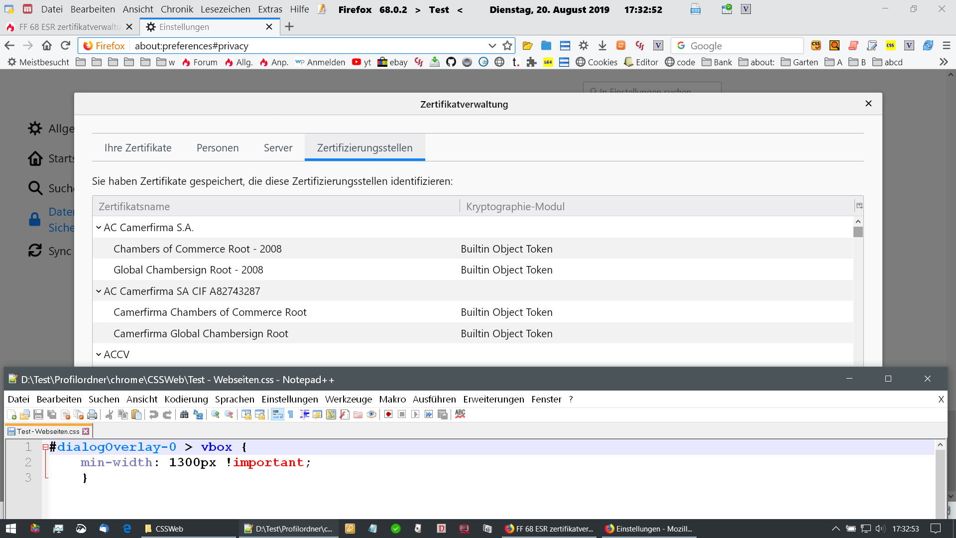 FF 68 ESR zertifikatverwaltung Panel Probleme