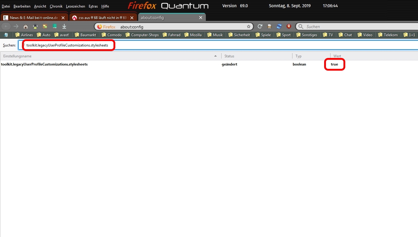 toolkit.legacyUserProfileCustomizations.stylesheets, dort muss der Schalter auf true, habe ich gemacht.