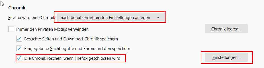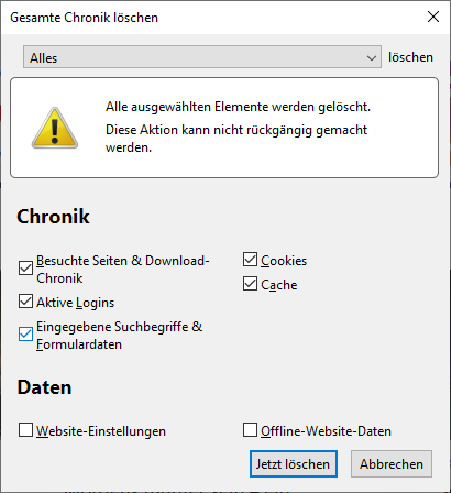 • Unter "Chronik löschen" habe ich alles angewählt außer "Cookies" (nicht angehakt, weil ich mich sonst jedes Mal neu im Google-Konto anmelden muss).