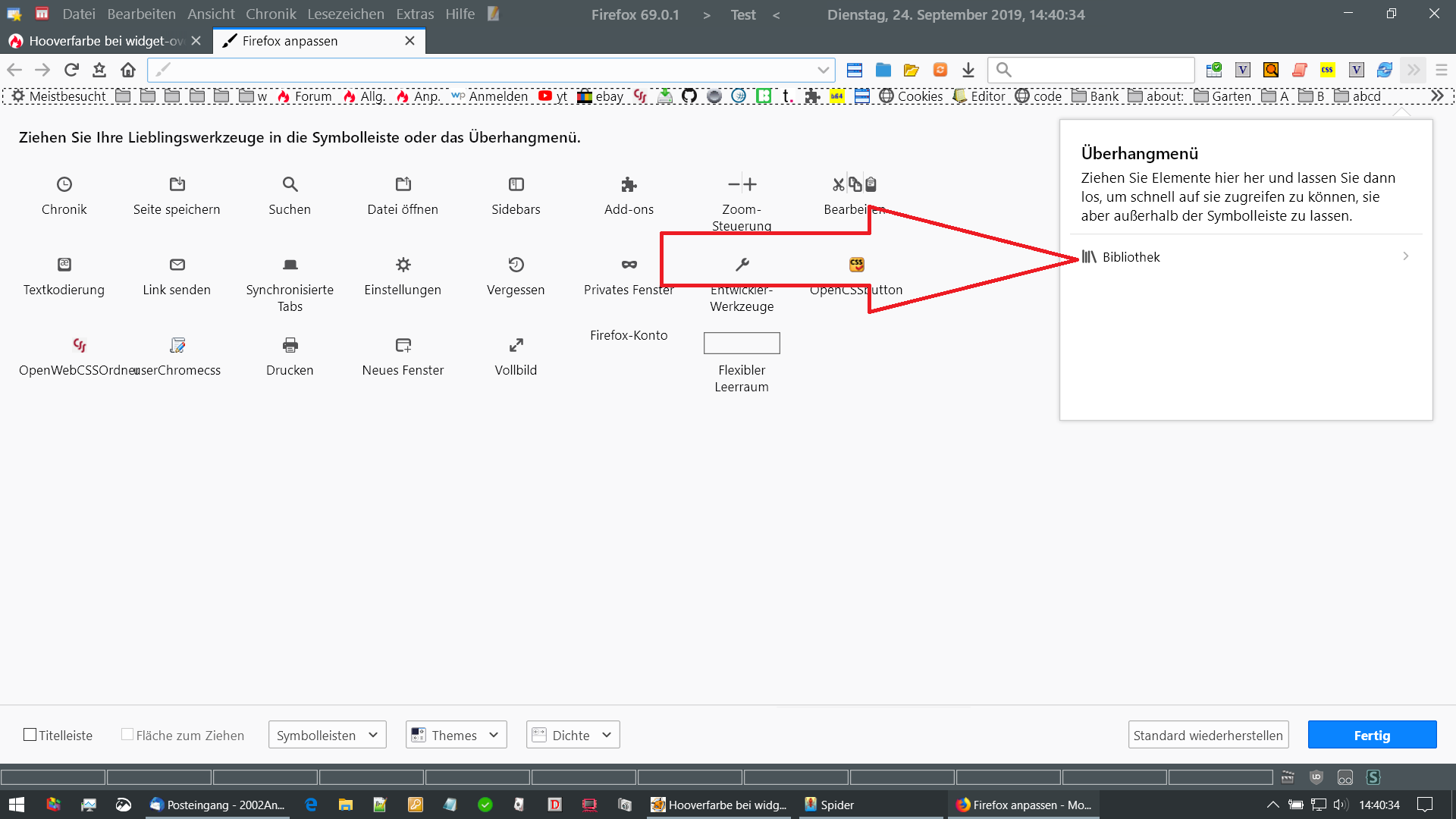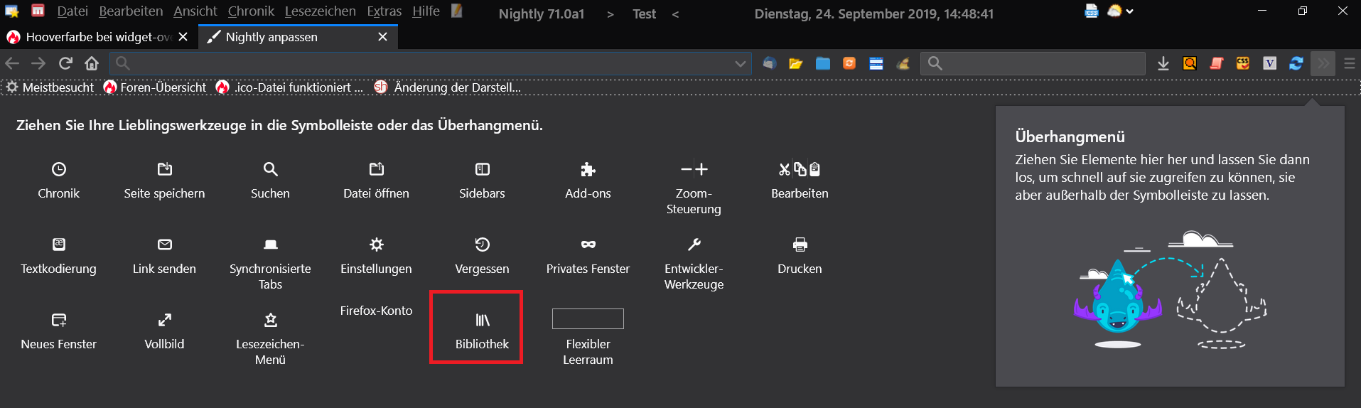 Im Lesezeichenmenü (das in der Adressleiste mit dem Button), und in der Sidebar konnte ich die "Hooverfarbe" beim Überfahren der einzelnen Menüeinträge auf mein geliebtes Graublau ändern, bei widget-overflow und PanelUI ist die Farbe allerdings mittelhellgrau vor hellgrauem Hintergrund, also fast nicht erkennbar.