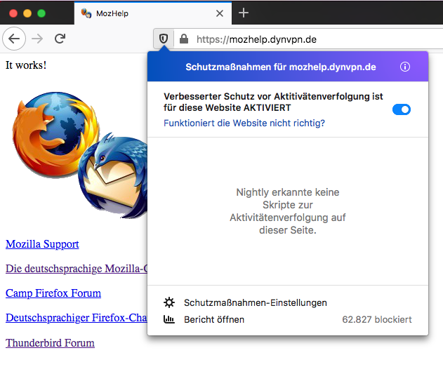 Dann scheint das ein Bug im Firefox zu sein. Für meinen eigenen Webserver habe ich den Vermerk "Blockierbare Seitenelemente gefunden". Das würde für mich heißen, das Firefox etwas gefunden hat. Als Kategorie steht "Cookies" > "Cookies von Drittanbietern werden blockiert". Klicke ich darauf, werden nur die Cookies für meine eigene Domain angezeigt aber logischerweise nicht blockiert. Daher frage ich mich, was genau den gefunden wurde, was denn angeblich blockierbar sei. Die eigenen Cookies können es nicht sein.