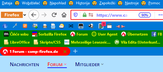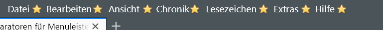 CSS#file-menu::after, #edit-menu::after, #view-menu::after, #history-menu::after, #bookmarksMenu::after, #tools-menu::after { display: block !important; content: '\2605' !important; font-size: 14px !important; color: yellow !important; }Bei meinem Code ist das Sternchen keine Grafik, sondern ein Unicode-Schriftzeichen mit dem Zeichencode u+2605. Schriftgröße ist 14px und Schriftfarbe Gelb, weil meine Menüleisten-Hintergrundfarbe Blau ist, da ist Gelb gut sichtbar. Hier mein Bildschirmfoto: