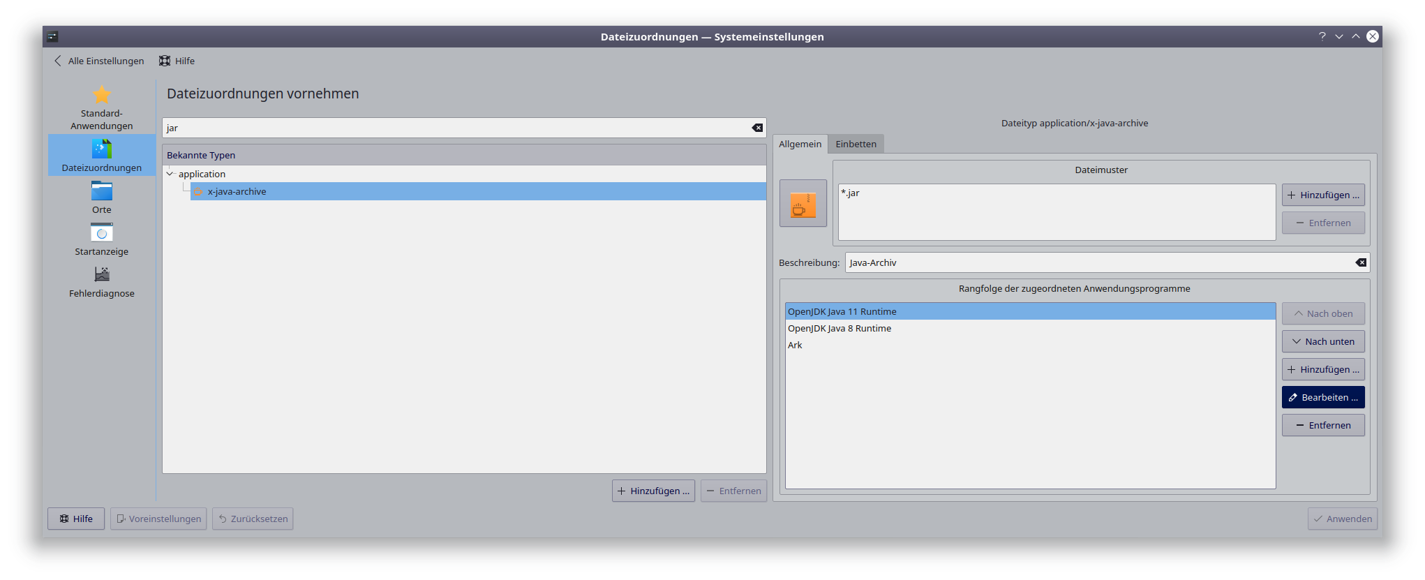 Dann habe ich diesen Programmstarter als Standard für .jar-Dateien festgelegt (das kann man entweder im Dateimanager, über Öffnen mit, oder aber im Terminal mit dem Befehl xdg-mime default Java.desktop application/x-java-archive bewerkstelligen).