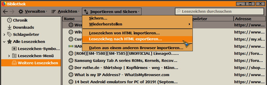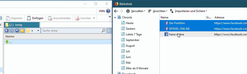 Meine Frage ist nun: Wenn ich diese Ordner außerhalb von Firefox im Windows-Explorer als Ordner anlege und (wichtig!) mehrere Lesezeichen aus Firefox gleichzeitig als HTML-Dateien in einen Ordner im Windows-Explorer ziehen und ablegen/speichern möchte: (Wie) Geht das?