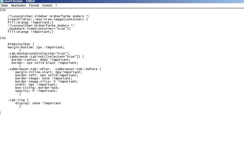 Kopiere jetzt den Code aus Beitrag #2 für die gelben Ordnersymbole und aus Beitrag #3 für die abgerundeten Ecken von 2002Andreas in deine userChrome.css.