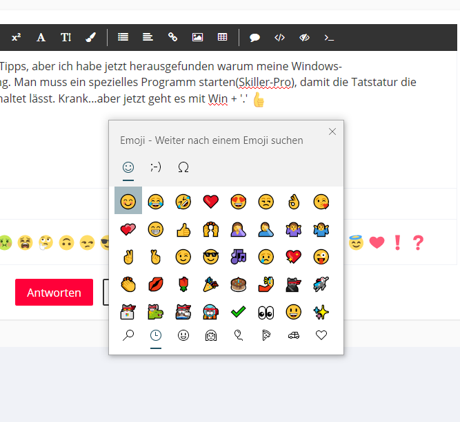 @Andreas&milupo : Danke euch beiden für die zusätzlichen Tipps, aber ich habe jetzt herausgefunden warum meine Windows-Taste bei meiner Sharkoon-Tastatur nicht mehr ging. Man muss ein spezielles Programm starten (Skiller-Pro), damit die Tatstatur die Windows-Taste für das ausgewählte Profil eingeschaltet lässt. Krank...aber jetzt geht es mit Win + '.' ![]()