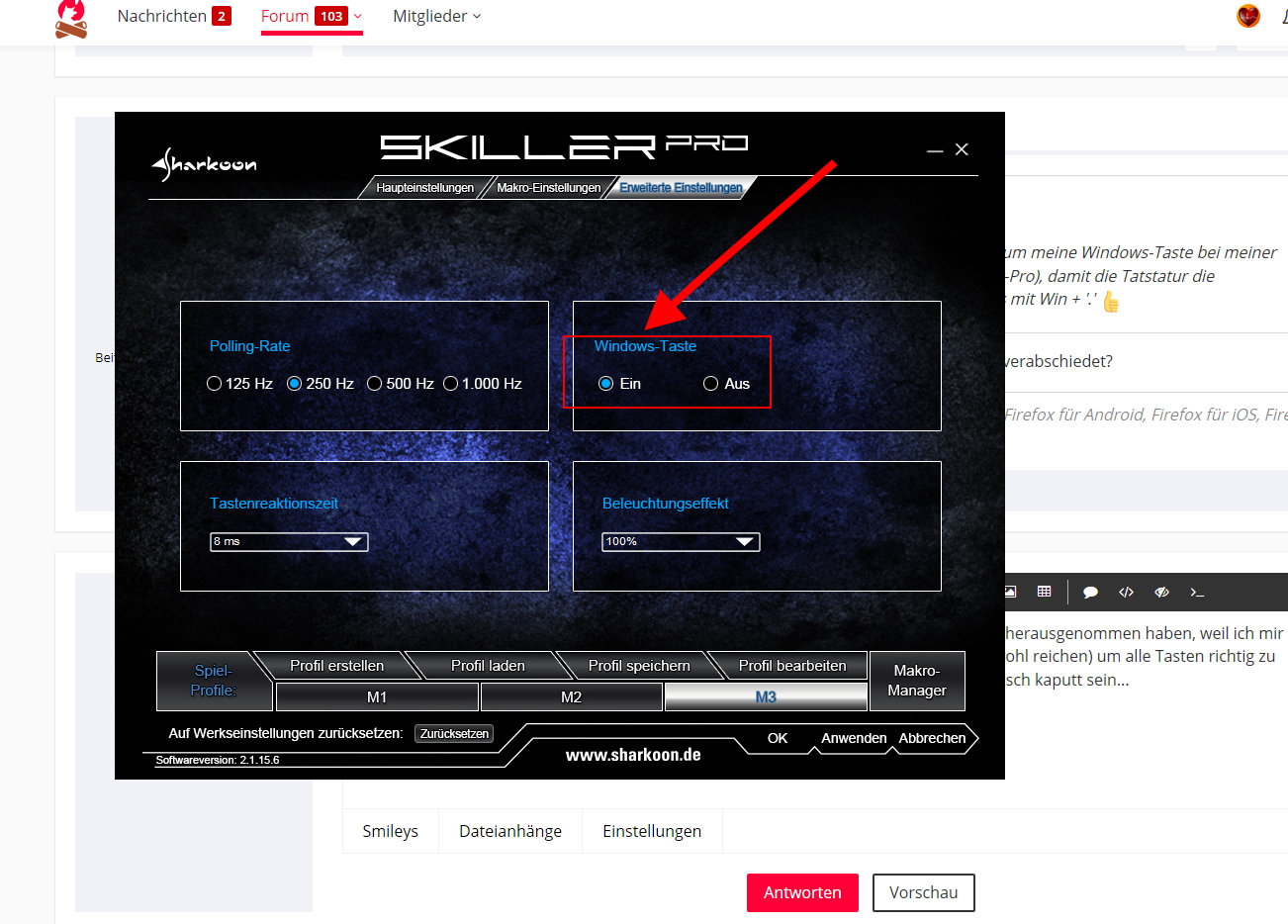 Nein, nicht eigenmächtig. Ich hatte das Programm anfänglich einmal gestartet und für mein Profil (M1) die Windows-Taste eingeschaltet. Da ich jetzt aber unabsichtlich ein anderes Profil (M3) benutze - das kann man per Extra-Taste auf der Tastatur umstellen - war die Windows Taste standardmäßig für dieses Profil (M3) auf 'Aus' eingestellt. Deswegen war ich die ganze Zeit der Meinung, die Taste kann nur mechanisch kaputt sein. Erst, als ich das Programm noch einmal gestartet habe und die Einstellung der Windows-Taste für alle Profile