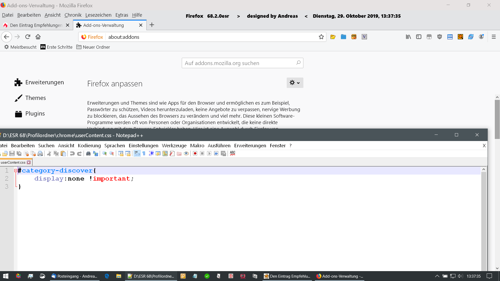 Ach ja, lohnt es sich eigentlich noch, dass man Stylish, Stylus, Greasemonkey, Tampermonkey, Violentmonkey oder was auch immer verwendet, da man ja bestimmte Sachen eh nur in der userChrome.css ändern kann? Ich suche primär den einfachsten Weg für alle Änderungen an der Oberfläche von Firefox.