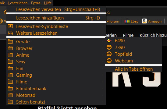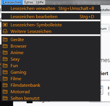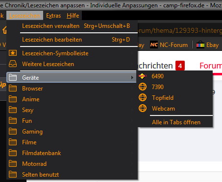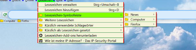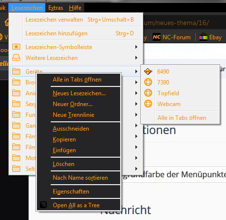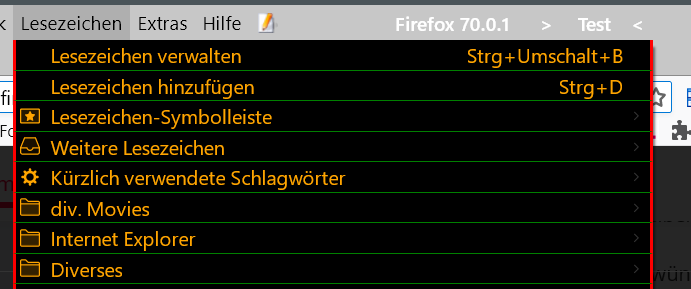 welcher mir die Hintergrund und Textfarbe der Menüpunkte (Datei, Bearbeiten usw und auch das Popupmenü wenn man einen Rechtsklick auf ein Lesezeichen macht) erfolgreich geändert hat. Leider wird der Hintergrund der Menüpunkte Lesezeichen und Chronik nicht geändert. Ich denk mal ein Bild zeigts besser.