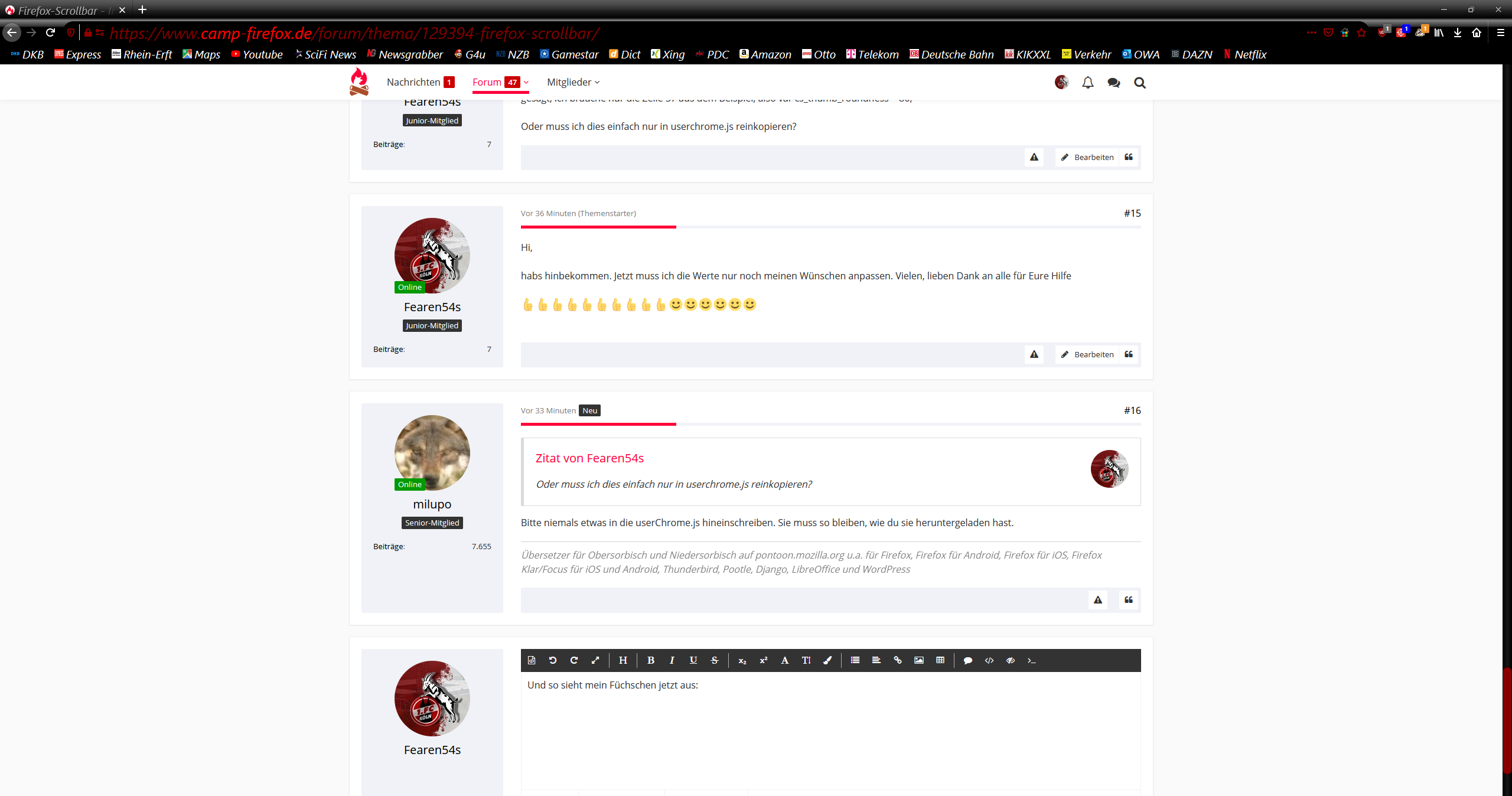 hab versucht, das Javascript anzuwenden, jedoch bin ich gescheitert. Wie muss ich das Script anwenden? Muss dies in den Chrome-Ordner des Profils rein? Ich bräuchte nur die von Andreas erwähnte Zeile 57, da ich die Farben wie Fuchsfan bereits per CSS nach meinen Wünschen anpassen konnte.