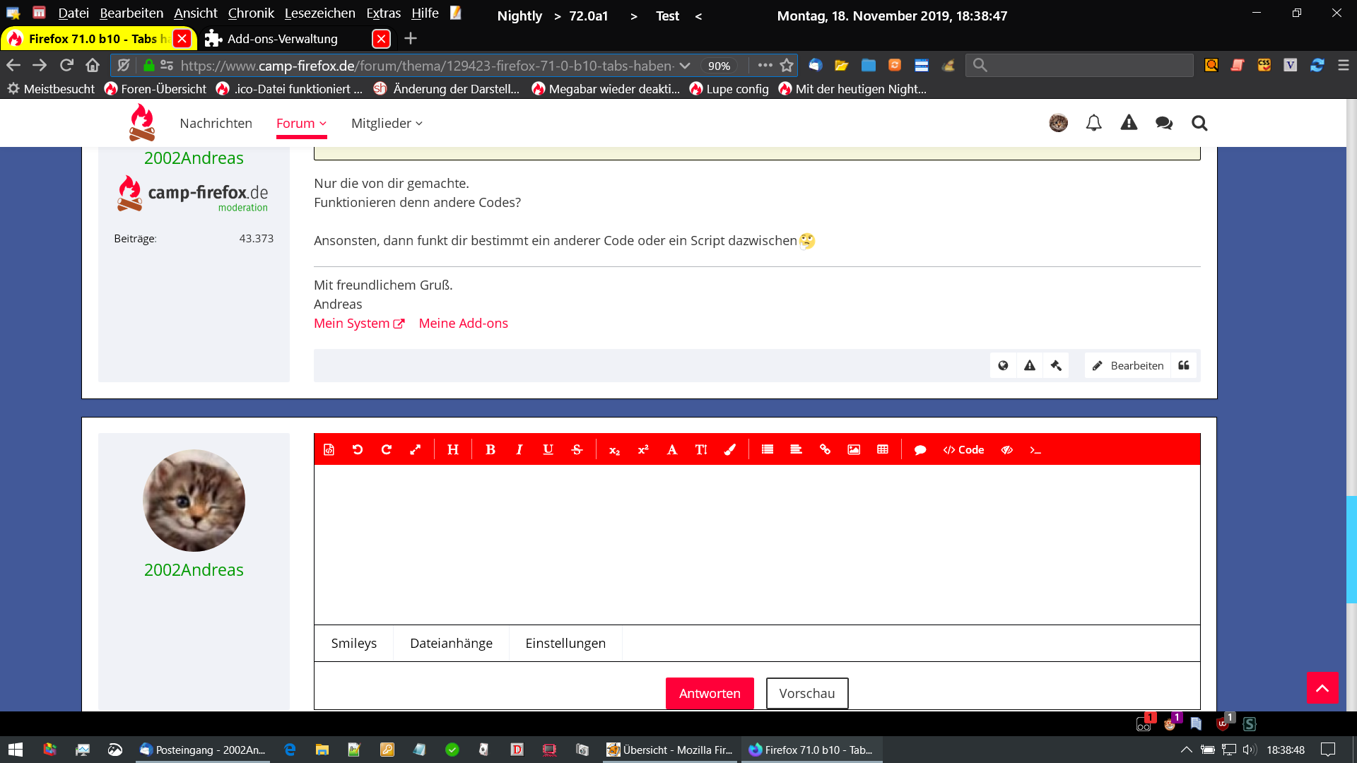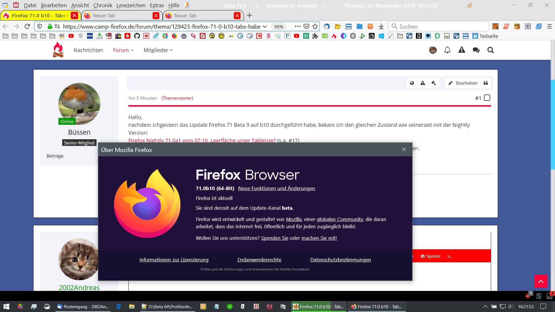 nachdem ichgestern das Update Firefox 71 Beta 9 auf b10 durchgeführt habe, bekam ich den gleichen Zustand wie seinerzeit mit der Nightly Version:
