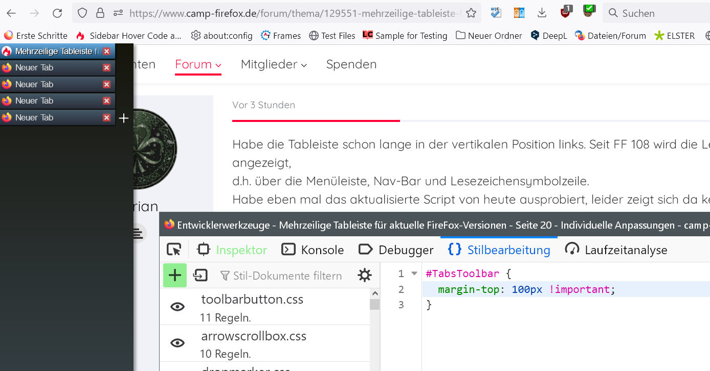 Habe die Tableiste schon lange in der vertikalen Position links. Seit FF 108 wird die Leiste komplett bis oben angezeigt,