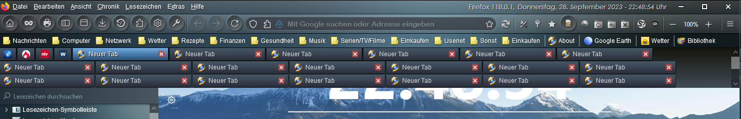 Aber man muss dazu sagen, dass die Fehlerbehebung jetzt etwas "erratisch" war, da ich hier den Fehler nicht nachvollziehen konnte. Das und das nur sporadische Auftreten bei dir, deutet leider auf ein Timing-Problem hin. An der Stelle habe ich was geändert. Außerdem habe ich die Firefox-Variable --tab-overflow-pinned-tabs-width jetzt standardmäßig auf 0px gesetzt (wenn ich in der Entwicklungsumgebung diesen Wert vergrößert hatte, dann konnte ich nämlich den gleichen Effekt, wie auf deinen Screenshots beobachten). Ich hoffe mal, dass das reicht...