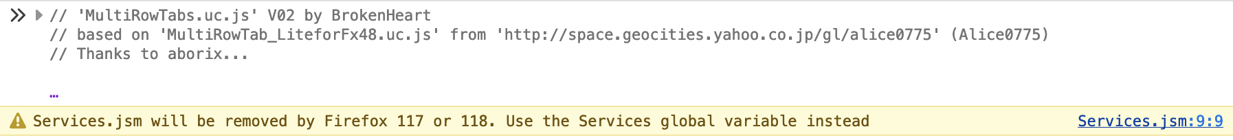 In diesem Fall wird bei Import von Services.jsm übrigens seit Firefox 116 eine Warnung in der Konsole über die bevorstehende Entfernung in Firefox 117 oder 118 ausgegeben.