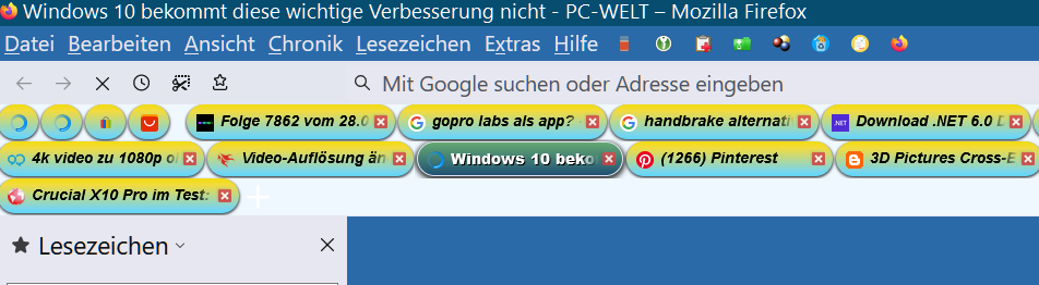 Aber man muss dazu sagen, dass die Fehlerbehebung jetzt etwas "erratisch" war, da ich hier den Fehler nicht nachvollziehen konnte. Das und das nur sporadische Auftreten bei dir, deutet leider auf ein Timing-Problem hin. An der Stelle habe ich was geändert. Außerdem habe ich die Firefox-Variable --tab-overflow-pinned-tabs-width jetzt standardmäßig auf 0px gesetzt (wenn ich in der Entwicklungsumgebung diesen Wert vergrößert hatte, dann konnte ich nämlich den gleichen Effekt, wie auf deinen Screenshots beobachten). Ich hoffe mal, dass das reicht... :/