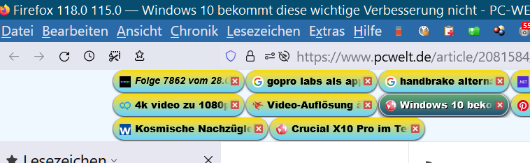 Aber man muss dazu sagen, dass die Fehlerbehebung jetzt etwas "erratisch" war, da ich hier den Fehler nicht nachvollziehen konnte. Das und das nur sporadische Auftreten bei dir, deutet leider auf ein Timing-Problem hin. An der Stelle habe ich was geändert. Außerdem habe ich die Firefox-Variable --tab-overflow-pinned-tabs-width jetzt standardmäßig auf 0px gesetzt (wenn ich in der Entwicklungsumgebung diesen Wert vergrößert hatte, dann konnte ich nämlich den gleichen Effekt, wie auf deinen Screenshots beobachten). Ich hoffe mal, dass das reicht... :/