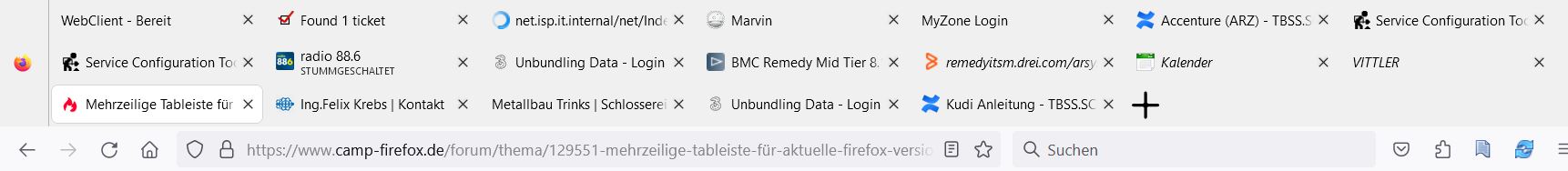 Ich habe die MultiRowTabs.uc.js von Seite 1 neu abgespeichert und entsprechenden Paramter der User-Settings übernommen. Jetzt sieht die Tableiste leider gar nicht mehr so aus wie vorher (habe es so angepasst, dass es quasi die originale FF-Optik gibt). Habe gelesen, dass das Script nicht mehr aktualisiert wird und die letzte unterstützte Version FF137 wäre?