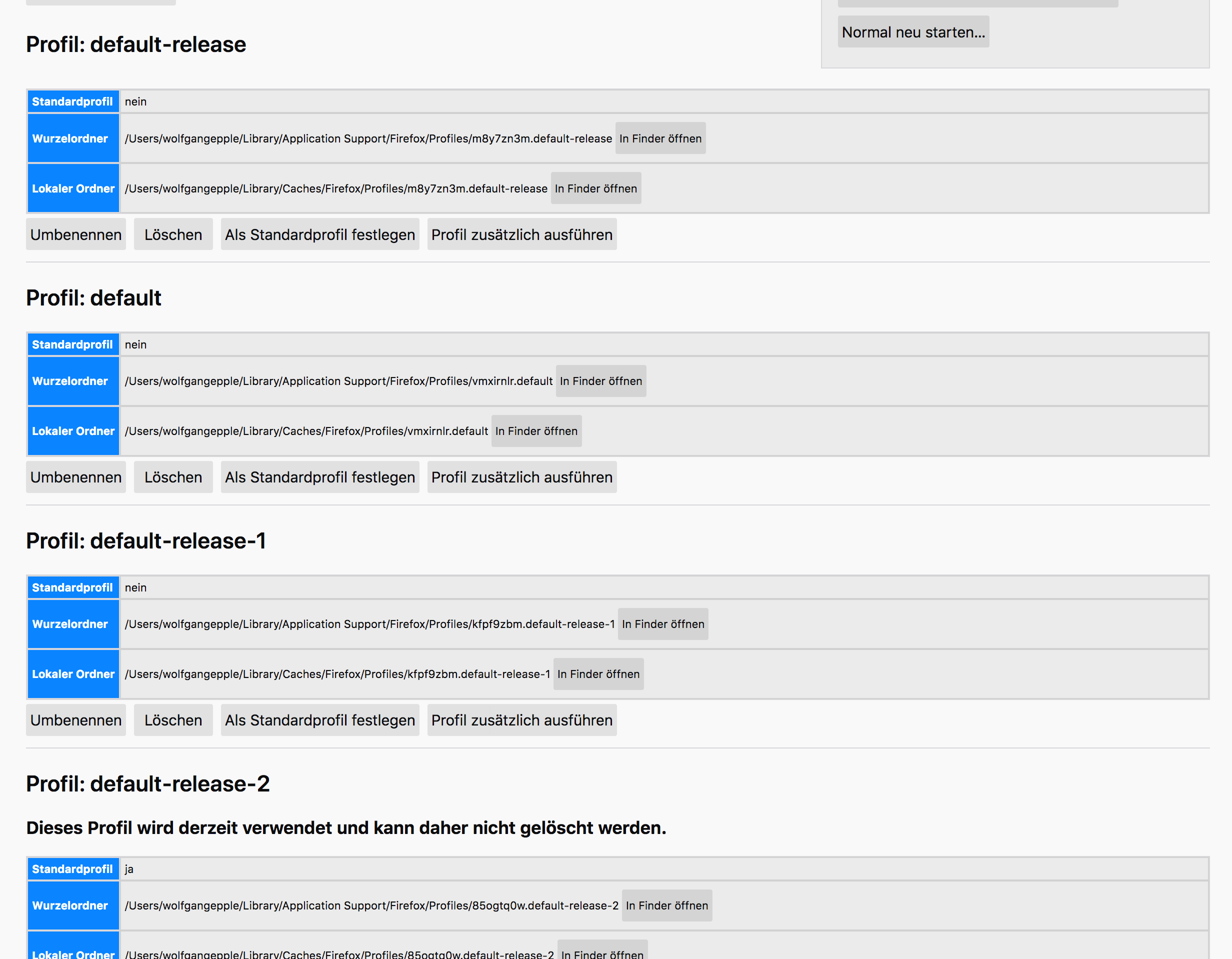 In meinem "Finder" auf dem Mac wird Firefox als "machine" geführt. Habe aber zusätzlich firefox nun auch in "Programme" kopiert. Wenn ich dann Firefox dort aufrufe, ist wieder das oben geschilderte Problem: Werde wie Neukunde behandelt. Die Rückmeldung per Mail von "Firefox Accounts" enthält jedesmal erkennbar meine korrekten Daten. Aber jeden Tag neue Anmeldung, weshalb...![]()