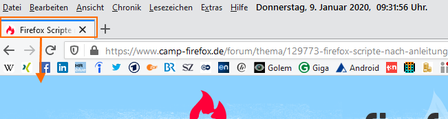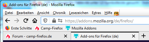 Ansonsten habe ich in meiner userChrome.css nur noch zwei Änderung zur Tabbreite (140px) und zur Ordnerfarbe der Lesezeichen (fill:orange).