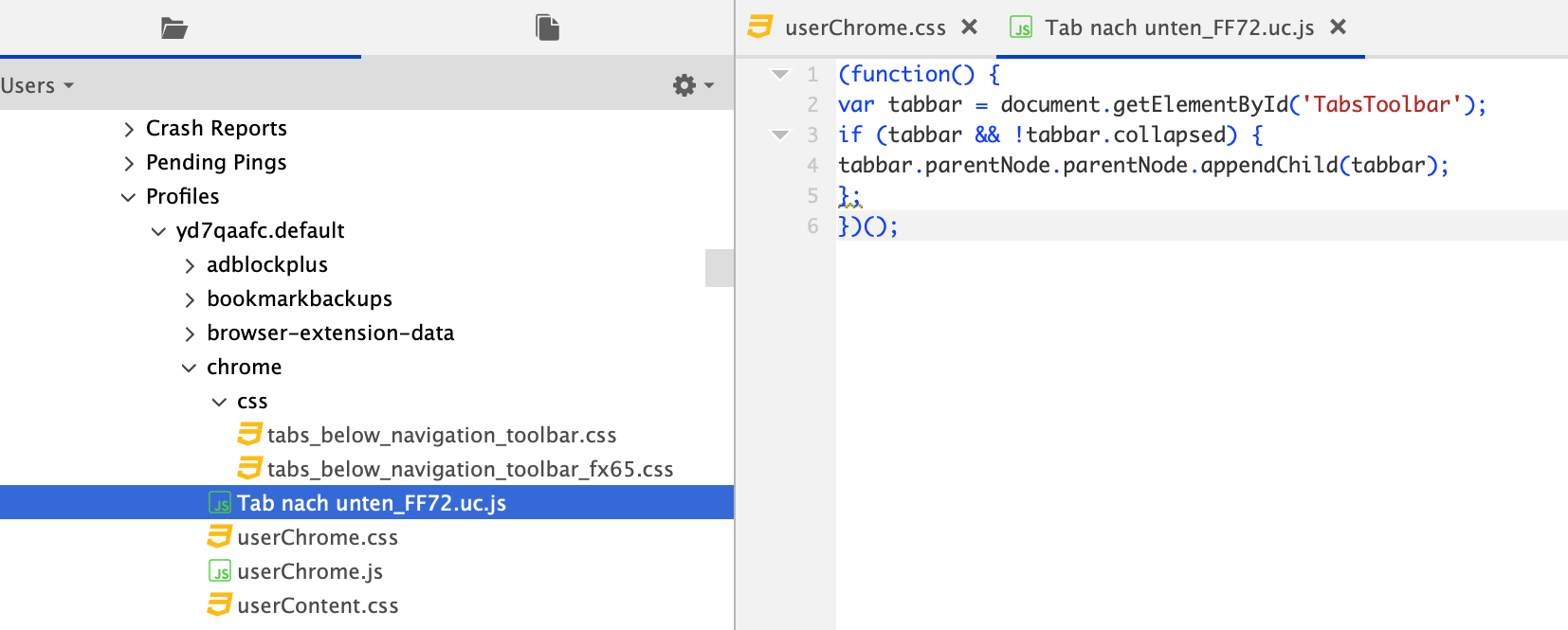 Hat leider nicht geklappt. Bei meinem Geschick habe ich aber bestimmt etwas falsch gemacht. Im Anhang mal ein Screenshot wie es jetzt bei "userChrome" aussieht.