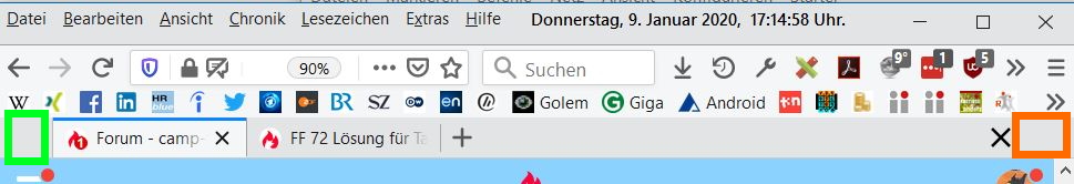 - Rechts (orange markiert) verschiebt sich das Tab-Schließen-Kreuz (AddOn Close Current Tab, für mich zweckmässig wenn ich mehrere Tabs hintereinander schließen will) durch einen Leerraum nach links.