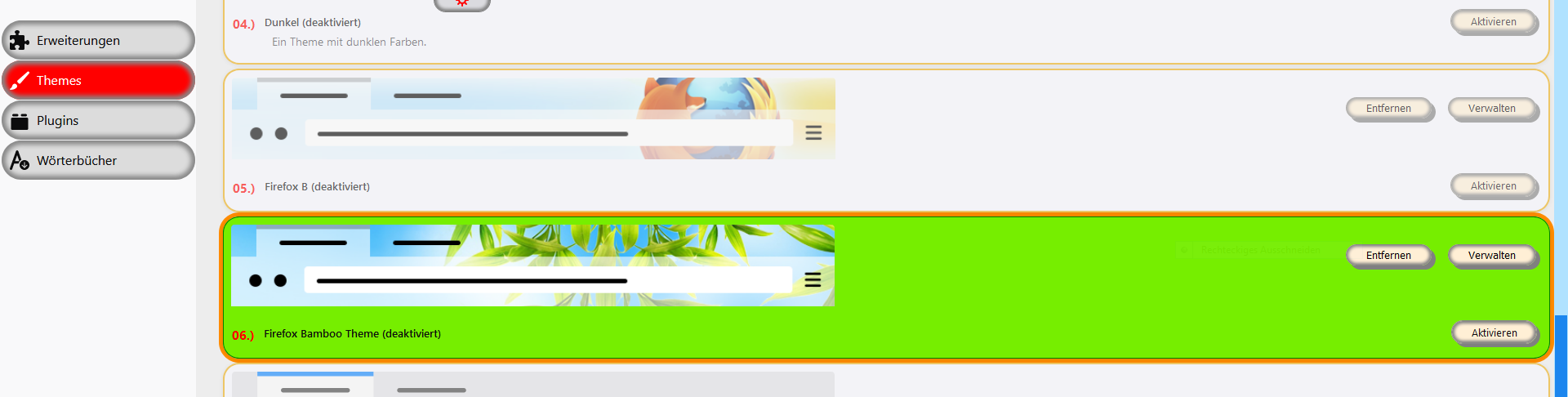Wenn man jetzt ein Themes aktiviert und dann mit der Maus nach rechts aus dem Bereich der Themes herrausfährt