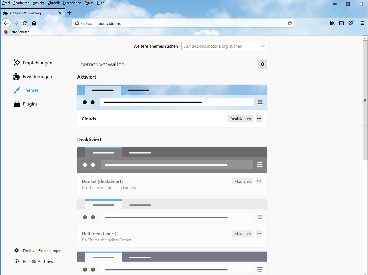Nur die 3 Standardthemes und die „empfohlenen Themes“ zu sehen.