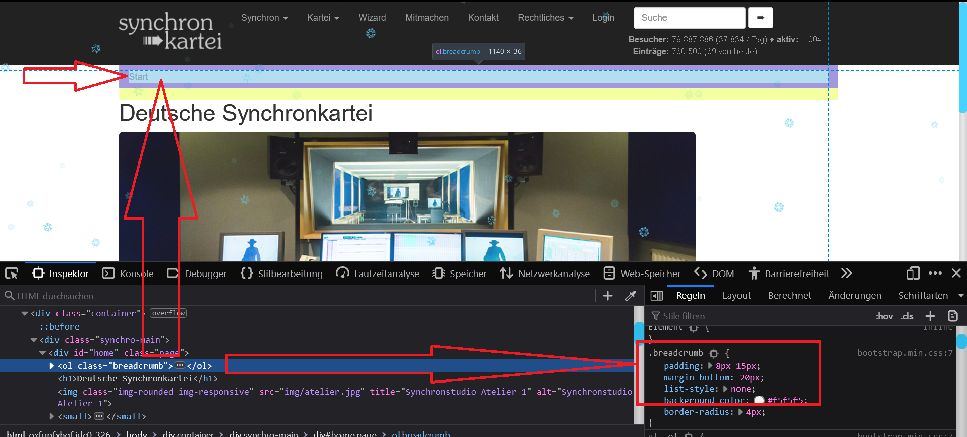 Noch ein Tipp: Klicke in den Entwicklerwerkzeugen auf das Symbol ganz links vor dem Wort Inspektor. Das wird jetzt blau untermalt. Du kannst nun mit der Maus über ein Element der Seite fahren. Das Element wird mit einer gestrichelten Linie umrahmt, und es wird dir der entsprechende CSS-Code und die dazugehörigen Abmessungen in einem Tooltip angezeigt. Du kannst das auch bei Andreas' Bildschirmfoto sehen. Dort steht: