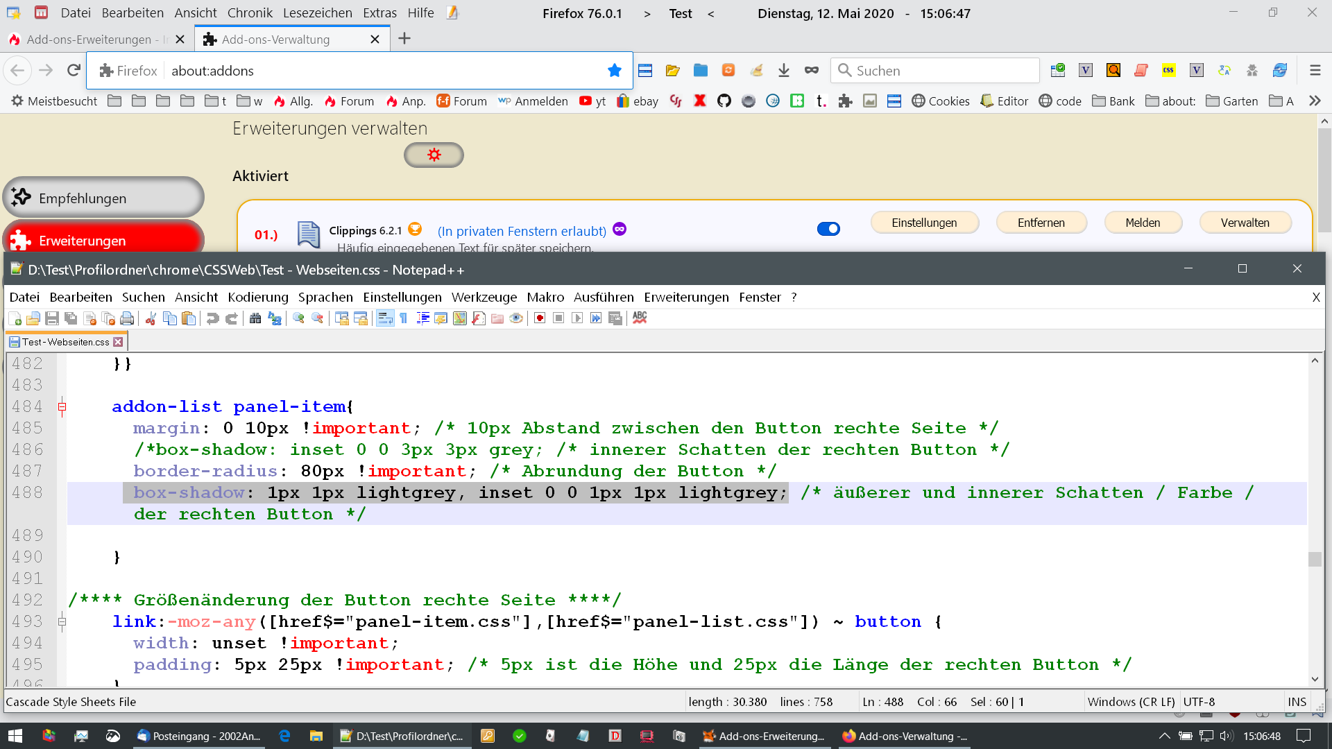 Klicke vor eine vorhandene Klammer. Gehe in Notepad++ in das Menü Suchen und wähle entweder Zugehörige Klammer suchen oder Alles zwischen Klammern auswählen. Alternativ kannst du die Tastenkombinationen Strg+B bzw. Strg+Alt+B verwenden. Mit Zugehörige Klammer suchen bzw. Strg+B springst du zur zugehörigen Klammer. Mit Alles zwischen Klammern auswählen bzw. Strg+Alt+B wird der Bereich zwischen öffnender und schließender Klammer markiert. In dem Moment weißt du, dass die Klammern korrekt gesetzt sind. Wenn eine Klammer schwarz bleibt und weder gesprungen noch markiert wird, weißt du, dass die zugehörige Klammer fehlt. Wenn du vor die erste Klammer nach der @-moz-document-Anweisung klickst und nach der zugehörigen Klammer suchst, springt Notepad++ in der Regel an das Ende deiner CSS-Datei, es sei denn, da sind noch mehr @-moz-document-Anweisungen enthalten.