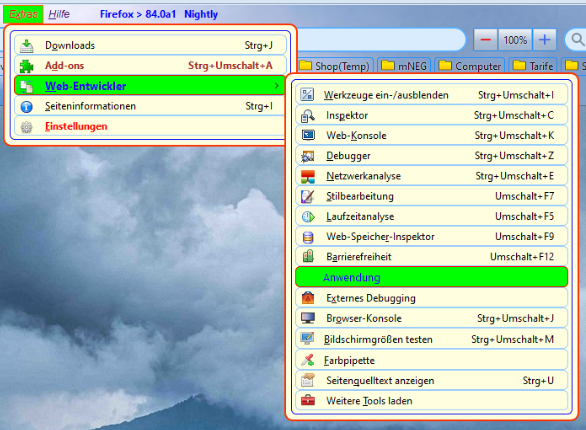 Weil wir gerade bei den Icons sind, von Fox 82 bis 84 fehlt das Icon im Menü Extras unter Web-Entwickler für den Eintrag Anwendung.