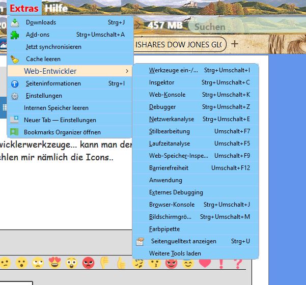 Ich nutze deinen Code für die Icons im Hamburgermenü für die Webentwicklerwerkzeuge... kann man den auch für den Webentwicklereintrag unter "Extras - Webentwickler" umstricken, da fehlen mir nämlich die Icons..