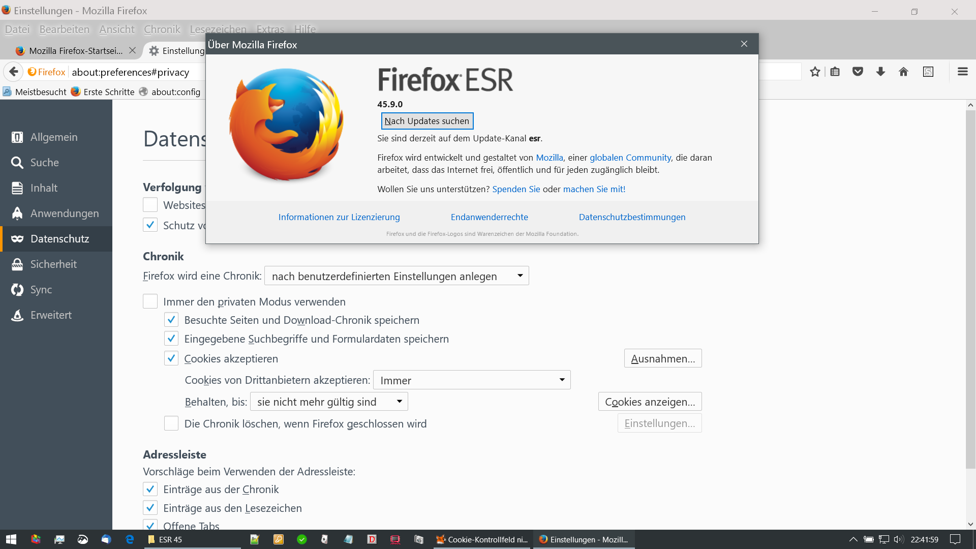 Die Datenschutzeinstellungen sind auf Standard gesetzt, als Erweiterung habe ich nur uBlock.