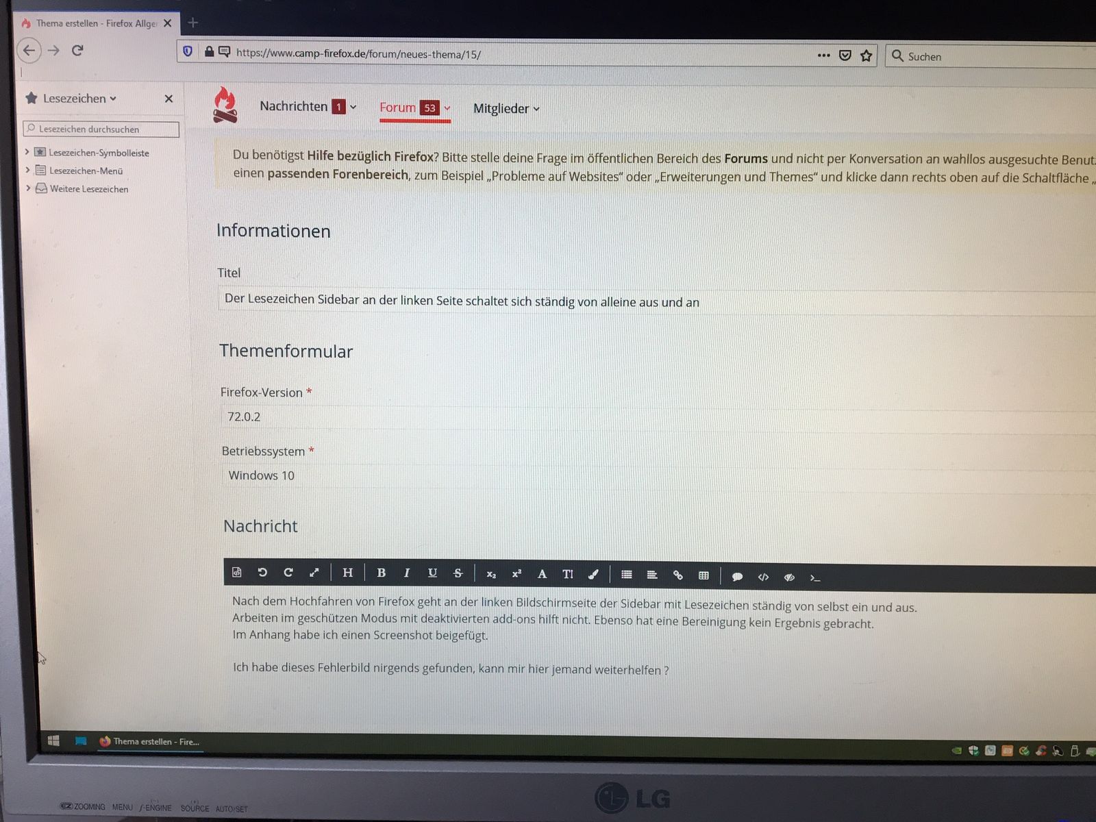 Nach dem Hochfahren von Firefox geht an der linken Bildschirmseite der Sidebar mit Lesezeichen ständig von selbst ein und aus. Ein Wegclicken des Sidebar bringt nicht, er geht dann (in nicht vorhersehbaren Abständen) wieder an.