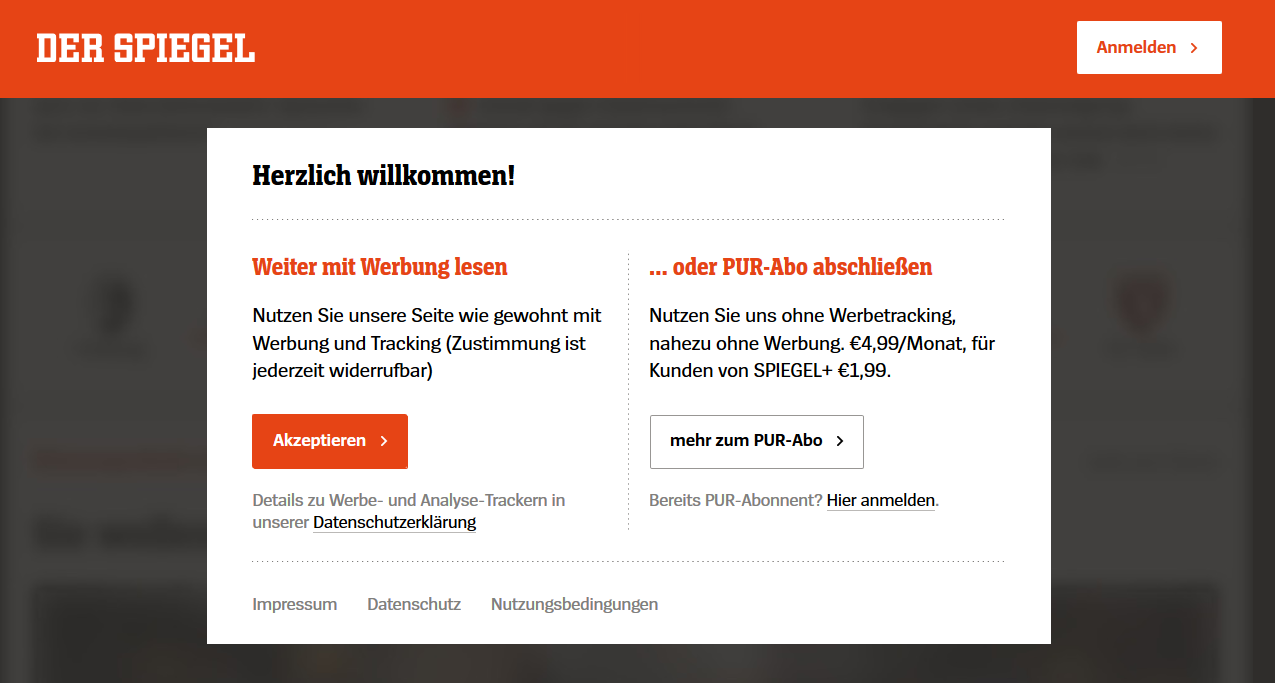 Seit ein oder zwei Tagen gibt es Probleme mit dem Firefox-Browser auf http://www.spiegel.de. Vorher konnte man die Website kostenlos mit den Standardeinstellungen des Firefox für die Aktivitätenverfolgung nutzen. Nun erscheint die folgende Anzeige: