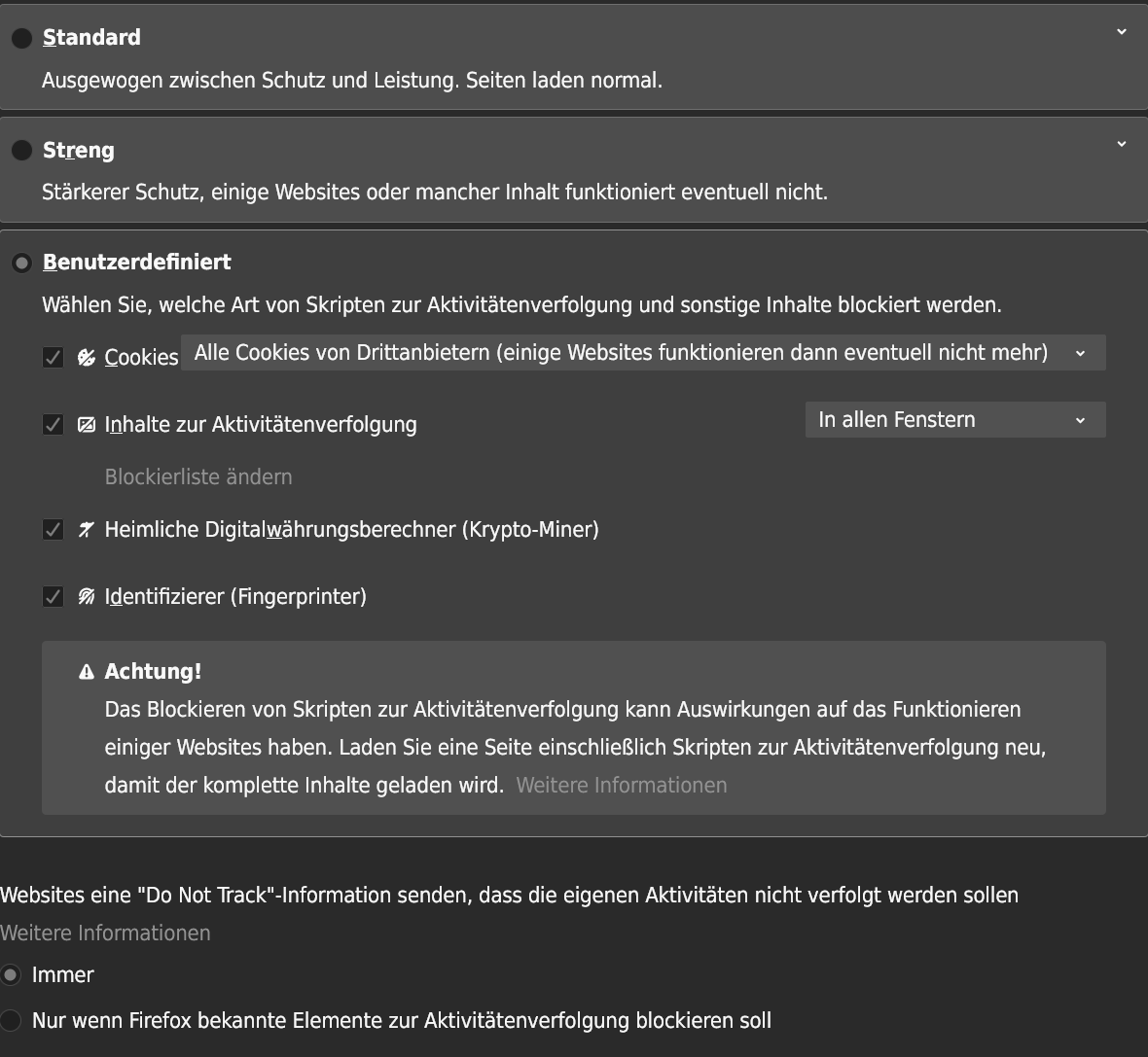 Was kann ich tun, um http://www.spiegel.de weiterhin nutzen zu können (zumindest die kostenlosen Artikel), ohne gleichzeitig die Sicherheitsstandards des Firefox (Standardeinstellung) bezüglich Aktivitätenverfolgung aufgeben zu müssen? Es geht nicht um den privaten Modus, sondern ein "normales" Fenster.