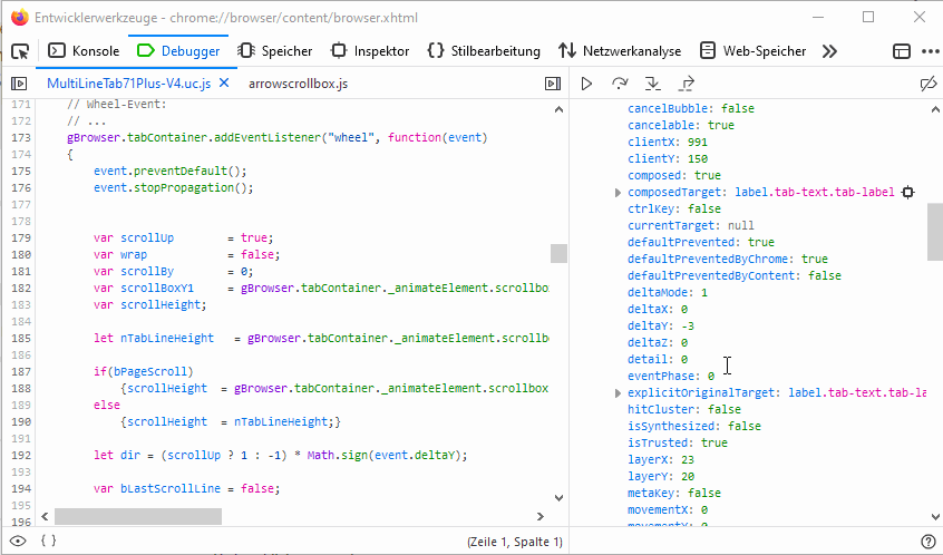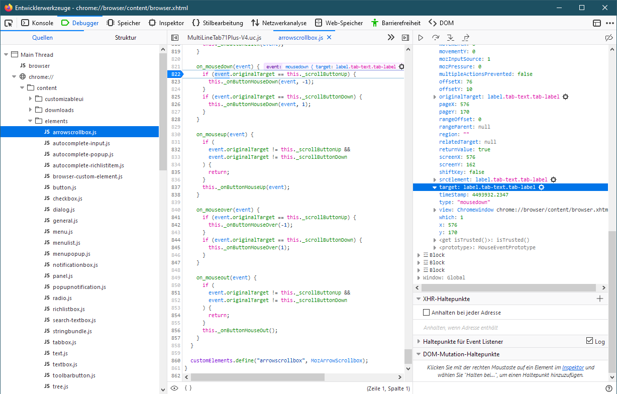 • Im Firefox auf einen Tab klicken. Dann sollte das Programm an Zeile 822 stoppen.