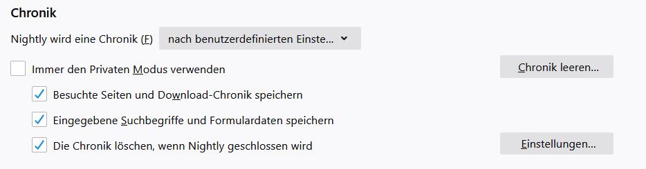 • Boersenfeger Ich hab die Einstellungen nun so gemacht und nach dem 1. Test eben müsste das so sein, wie ich das haben wollte. Vielen Dank dafür. Ich wusste nicht, dass man sowas über die Chronik steuern kann, was beim Beenden gelöscht werden soll - wieder was dazugelernt.