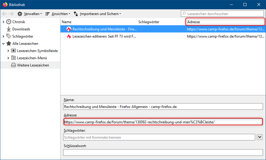 • Wird dir denn die Spalte „Adresse“ im Lesezeichenmanager angezeigt oder nicht?