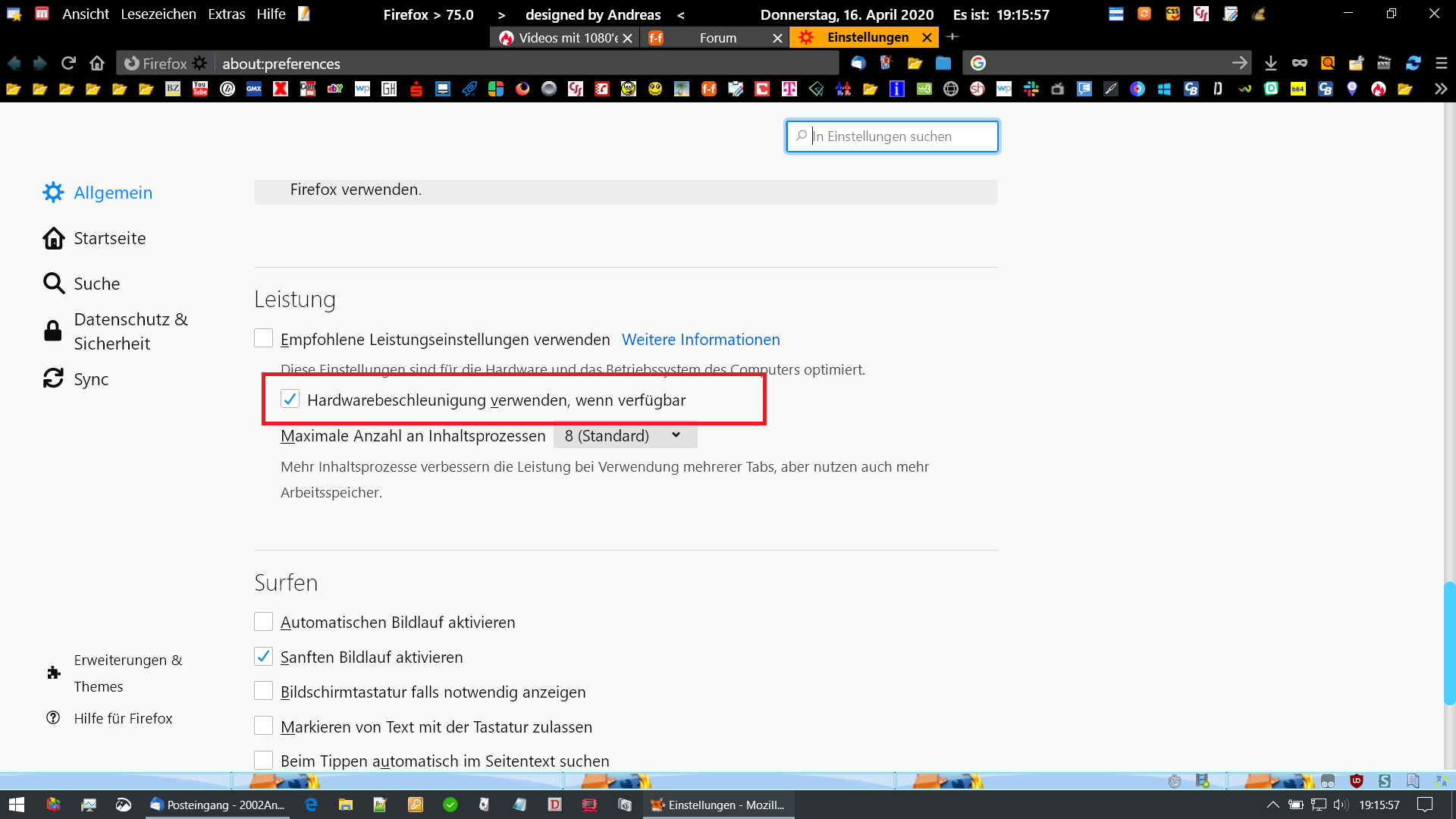 Das Notebook hängt am LAN und Bandbreite ist mehr als genug vorhanden. Ein Virenscanner ist auch nicht aktiv, es sind keine anderen Add-ons installiert, alles ist hier wirklich frisch installiert. Dann habe ich unter Firefox die Hardwarebeschleunigung mal abgeschaltet, aber das hat auch nicht geholfen.