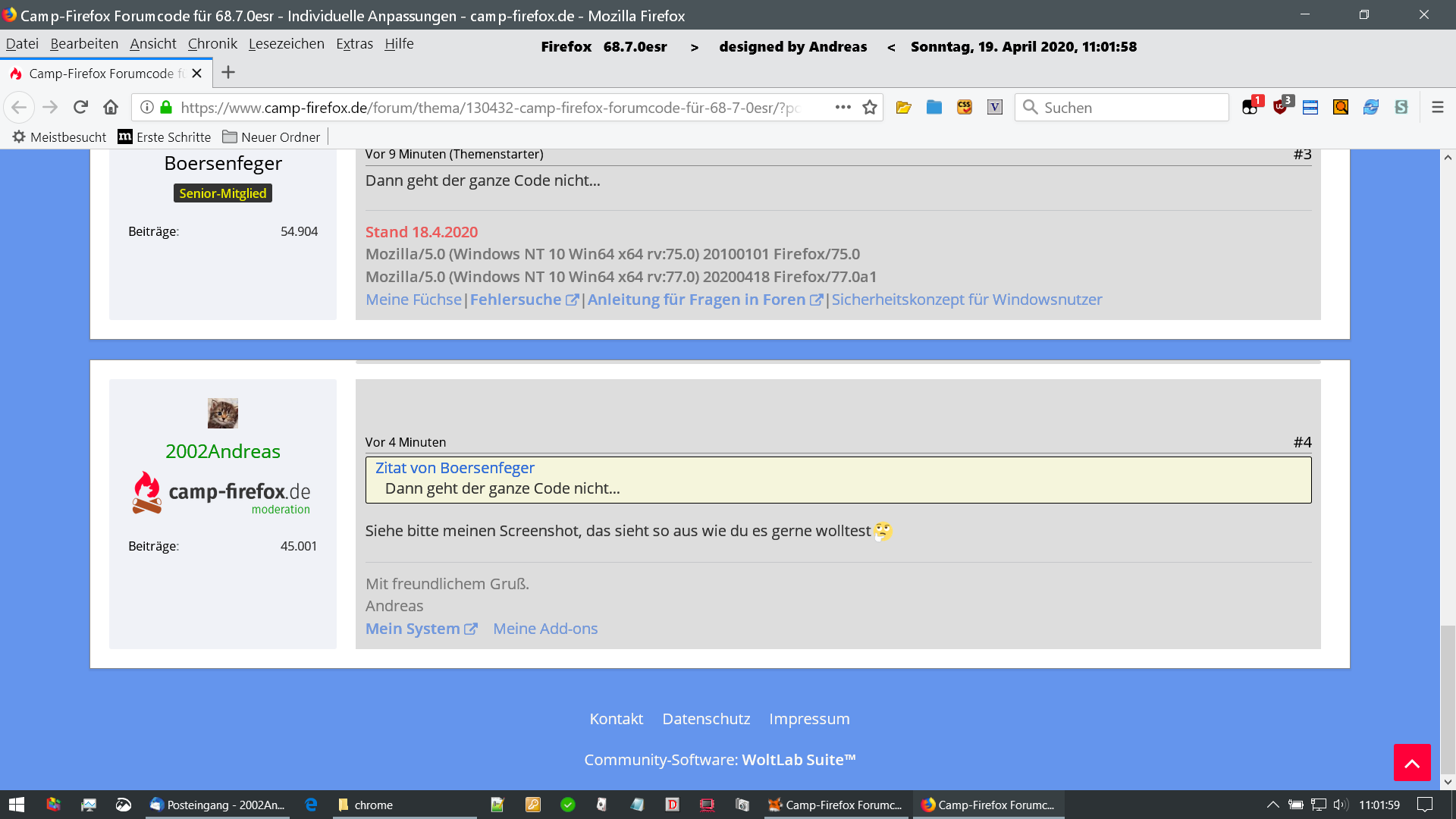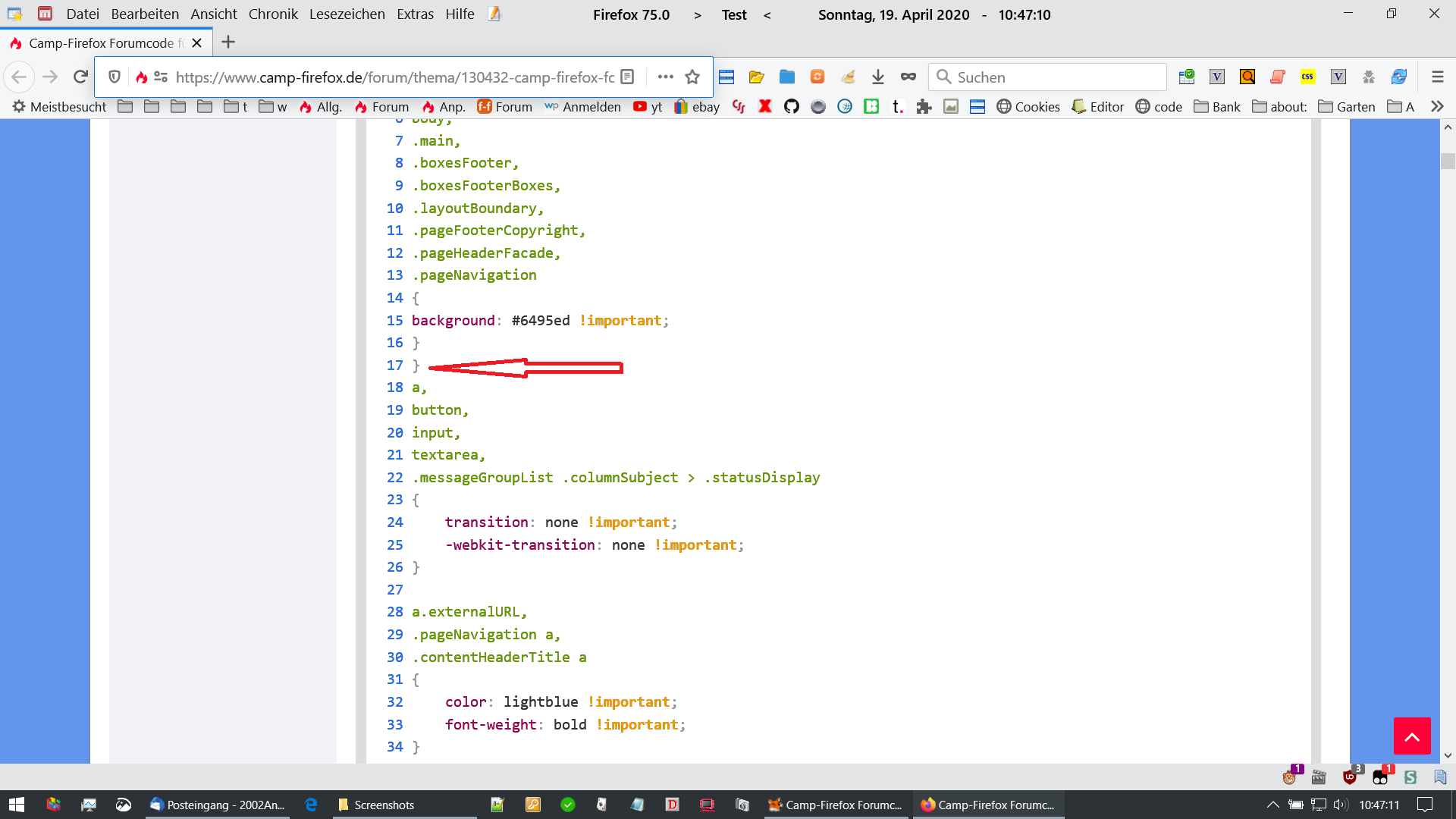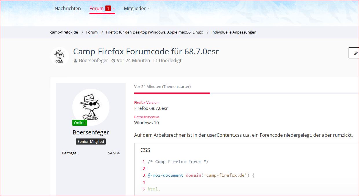 Auf dem Arbeitsrechner ist in der userContent.css u.a. ein Forencode niedergelegt, der aber rumzickt.