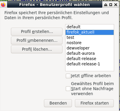 Beim Start von Firefox kam die Abrage welches Profile verwendet werden soll.